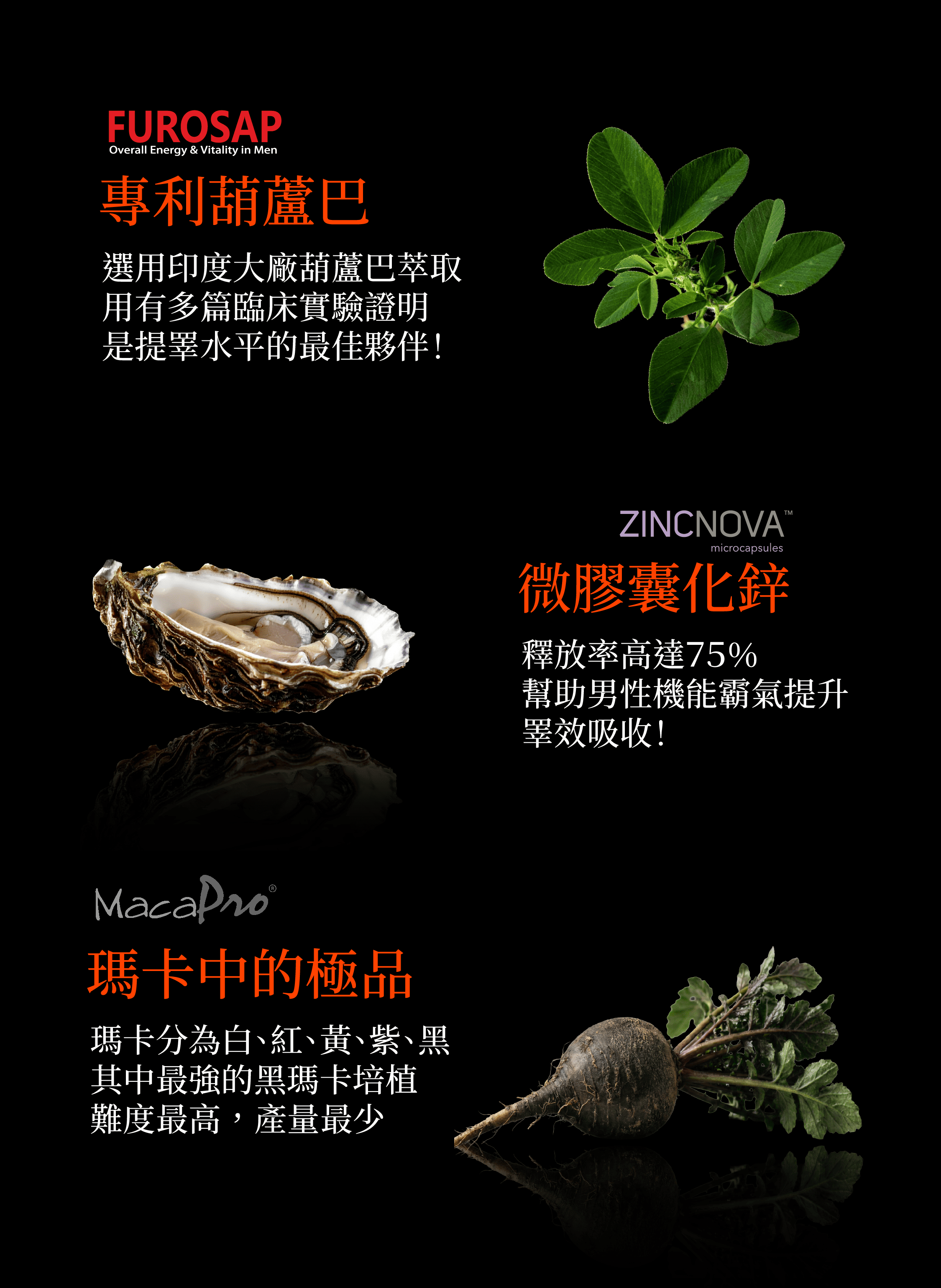 成份:秘魯黑瑪卡萃取物(MacaPro®*)、葫蘆巴萃取物(Furosap®)、玉米澱粉、微膠囊鋅(Zincnova®)、二氧化矽、硬酯酸鎂